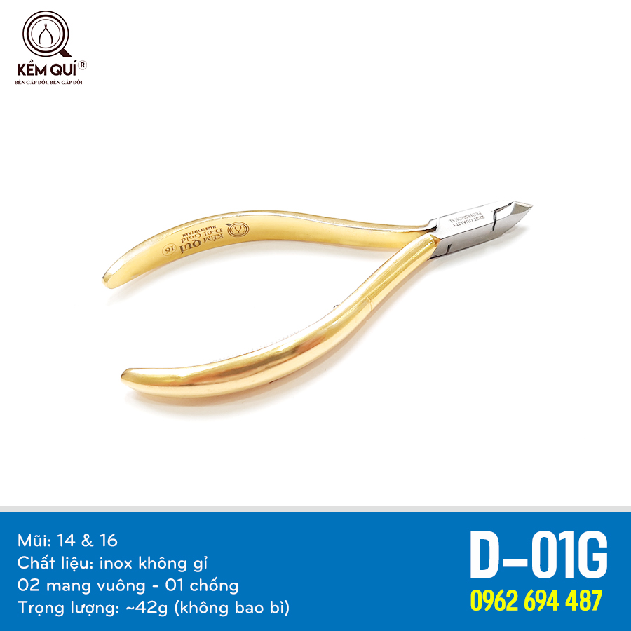 - Kềm Quí D-01G được làm hoàn toàn từ chất liệu inox cobalt không gỉ được mạ một lớp vàng có chức năng bảo vệ, vừa đem lại sự sang trọng vừa kéo dài tuổi thọ của kềm.