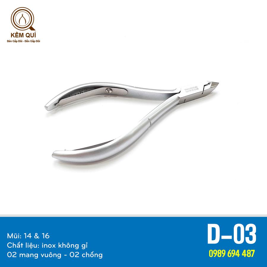 - Kềm Quí D-03 được làm hoàn toàn bằng chất liệu inox cobalt (thép không gỉ) đem lại độ bền bỉ vượt trội hơn các loại kềm thông thường khác.