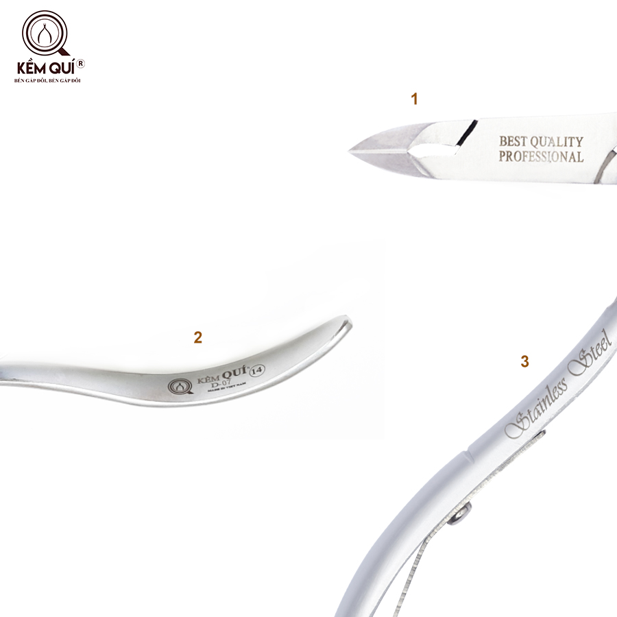 - Trên thân kềm Quí D-07 được khắc logo thương hiệu kềm Quí và mã của sản phẩm giúp khách hàng dễ dàng phân biệt, nhờ sử dụng công nghệ khắc lazer hiện đại mà từng nét khắc đều rõ ràng, tỉ mỉ.