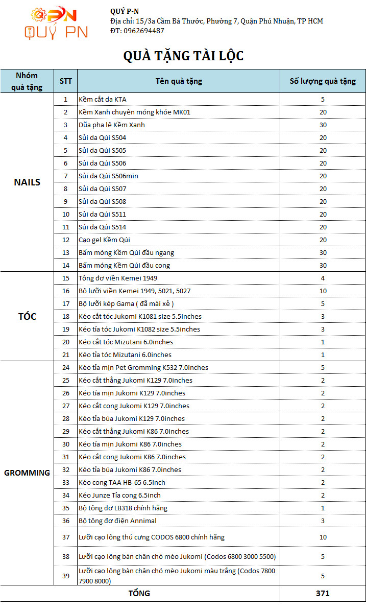 - Xuyên suốt 2 ngày mùng 10 – 11 Tết Giáp Thìn 2024, Quý PN dành tặng khách hàng 10 % (số 10 Thần Tài may mắn) trên tổng hóa đơn sản phẩm hoặc dịch vụ mài trong ngày, quý khách được quy đổi chọn phần quà hoặc sản phẩm bất kỳ tại Quý PN tương đương giá trị.
